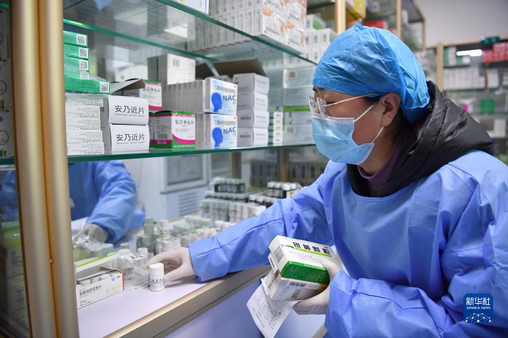 1月3日,西安市長(cháng)安區灤鎮街道社區衛生服務(wù)中心藥房的工作人員為患者配退燒止咳藥。