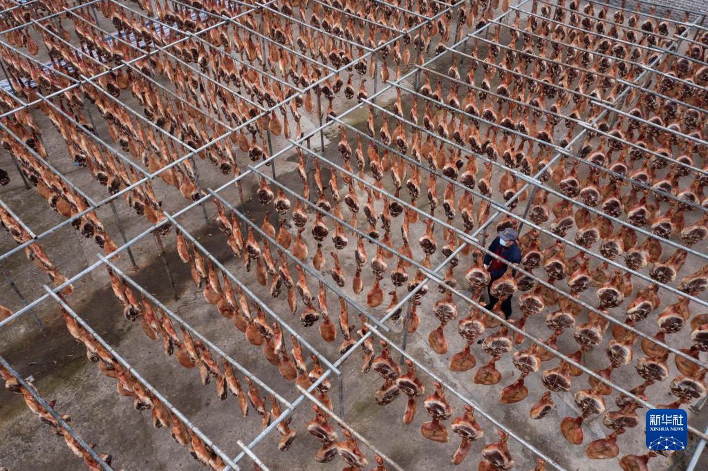 1月4日,在位于金華市金東區澧浦鎮的金華金年火腿有限公司曬場(chǎng)上,工人在查看金華火腿的晾曬情況(無(wú)人機照片)。