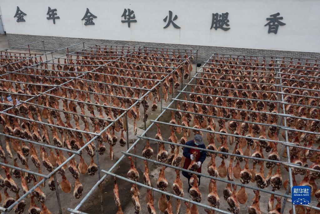 1月4日,在位于金華市金東區澧浦鎮的金華金年火腿有限公司曬場(chǎng)上,工人在查看金華火腿的晾曬情況(無(wú)人機照片)。