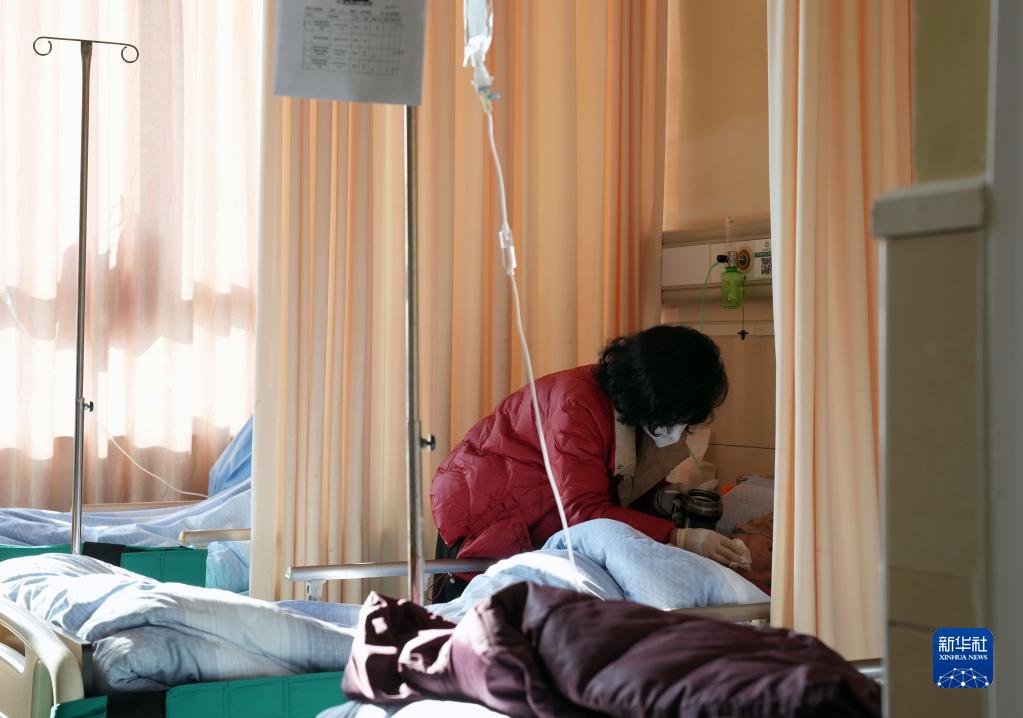 1月4日,在上海市松江區九亭鎮社區衛生服務(wù)中心病房,一位女士在照顧90歲的母親。