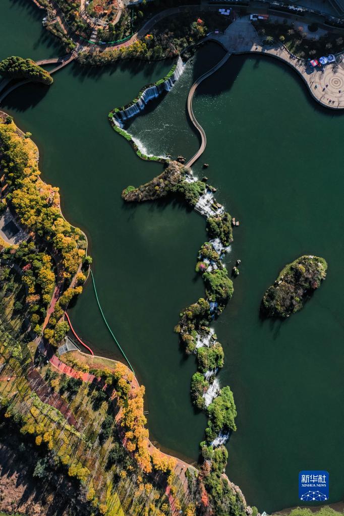 1月4日拍攝的昆明市瀑布公園一景(無(wú)人機照片)。