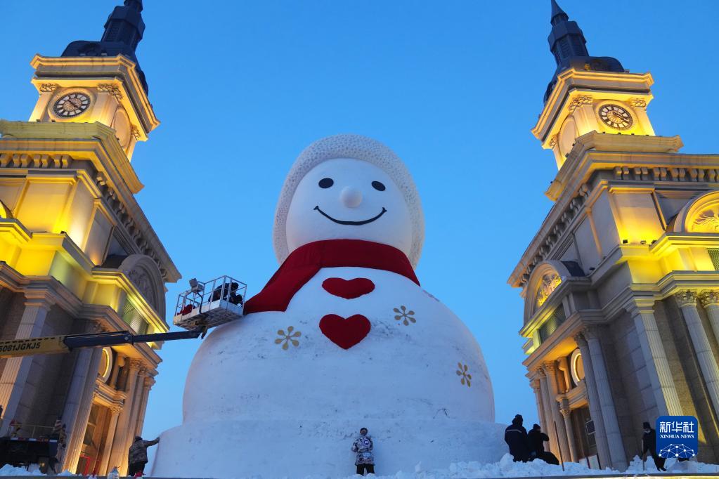 1月4日,在哈爾濱松花江畔,工人進(jìn)行大雪人收尾工作。