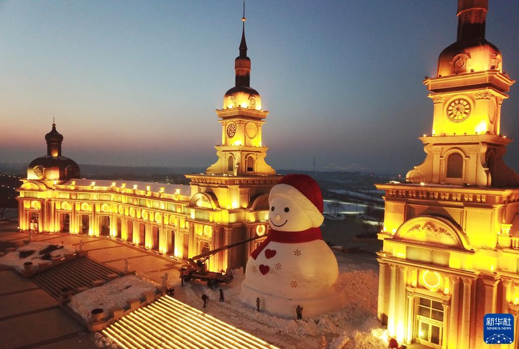 1月4日,在哈爾濱松花江畔,工人進(jìn)行大雪人收尾工作(無(wú)人機照片)。