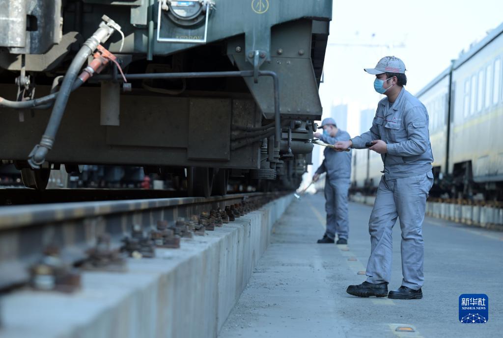 1月4日,在中國鐵路上海局集團有限公司合肥車(chē)輛段合肥客車(chē)整備場(chǎng),工作人員對旅客列車(chē)走行部進(jìn)行整修。