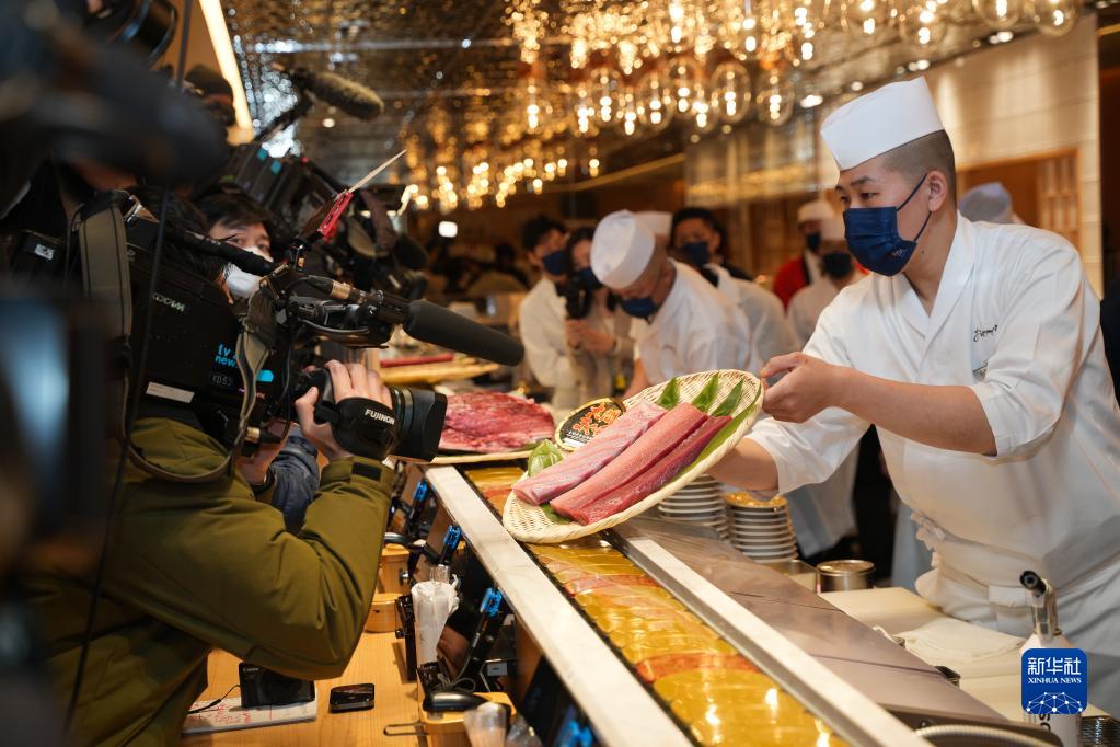 1月5日,廚師在日本東京表參道一家餐館向媒體展示最高價(jià)金槍魚(yú)的魚(yú)肉。