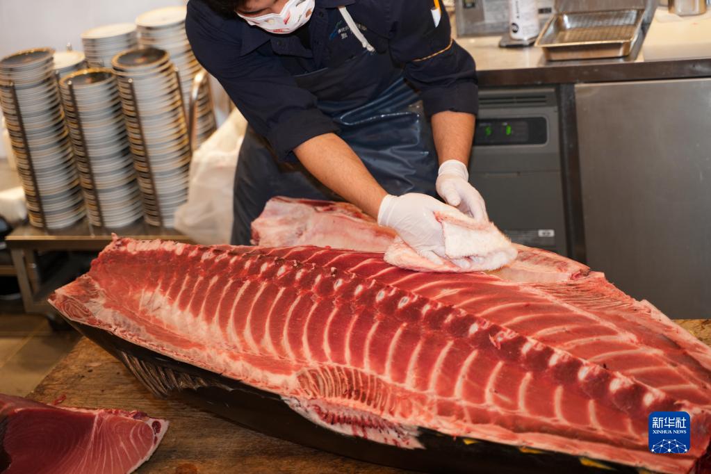 1月5日,廚師在日本東京表參道一家餐館擦拭最高價(jià)金槍魚(yú)的魚(yú)肉。