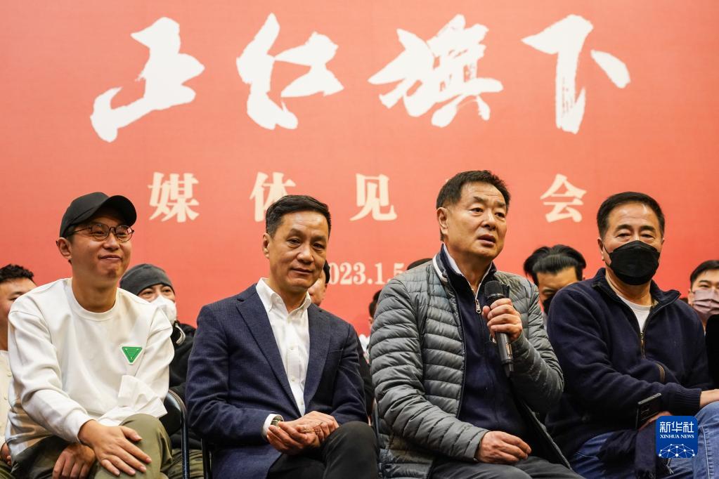 1月5日,在北京人藝排練廳,演員濮存昕(右二)在媒體見(jiàn)面會(huì )現場(chǎng)與記者交流。