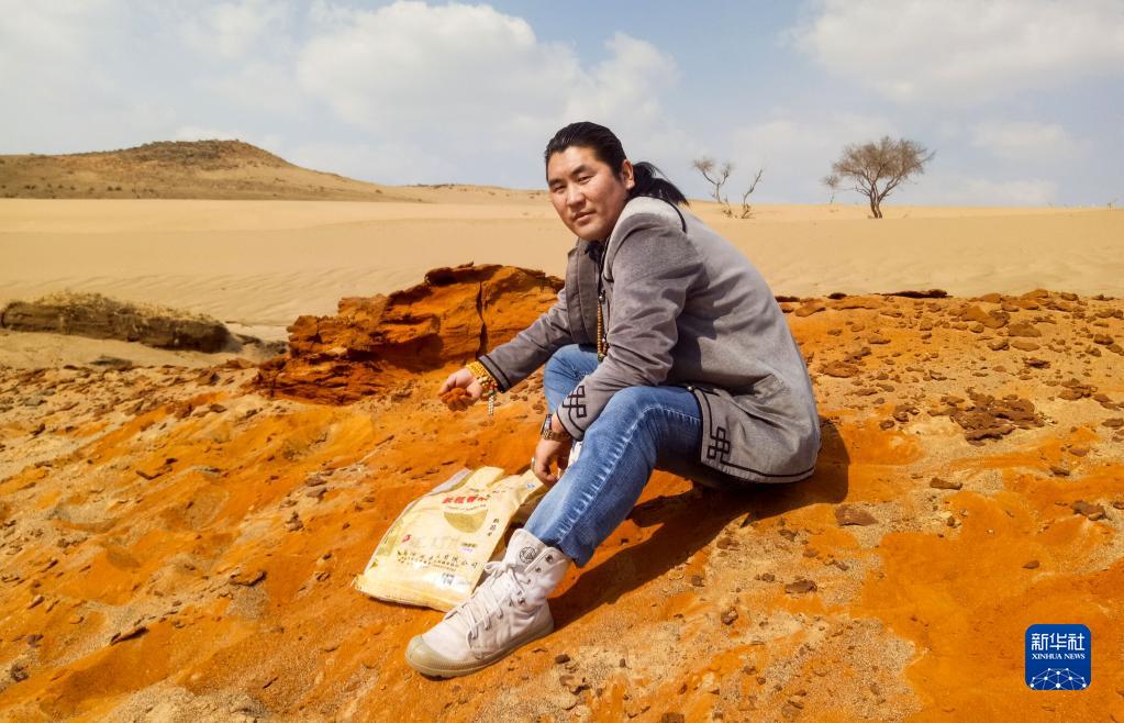 阿拉騰畢力格在渾善達克沙地中尋找適合制作沙畫(huà)的沙粒(2017年攝)。