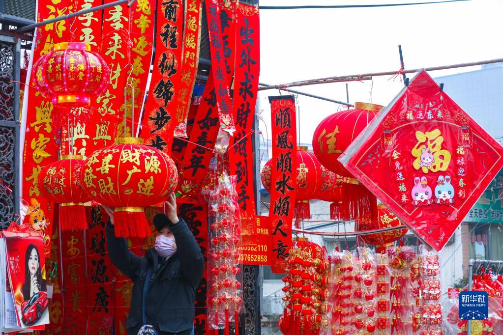 春節臨近,年味漸濃,河南省信陽(yáng)市以“兔年”為主題的各種對聯(lián)、年畫(huà)、“?!弊值蕊椘芳娂娚霞?,成為市民搶手的熱門(mén)商品。
