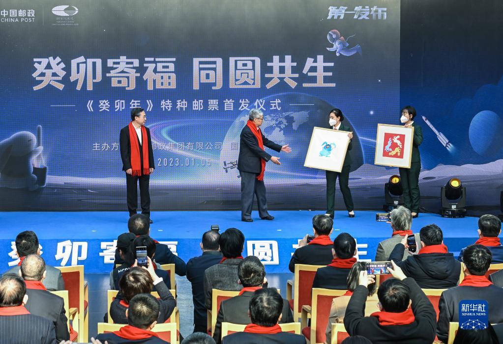 1月5日,由藝術(shù)家黃永玉繪制的郵票設計畫(huà)稿在《癸卯年》特種郵票首發(fā)儀式上亮相。
