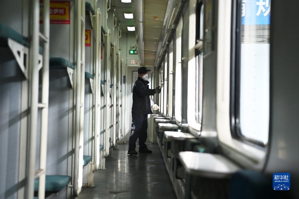 1月6日,在中國鐵路太原局集團有限公司太原車(chē)輛段太原檢修車(chē)間,工作人員在檢修列車(chē)車(chē)窗。