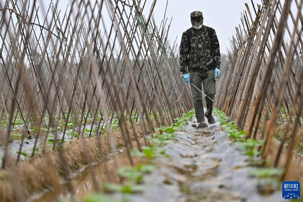 1月5日,在海南省澄邁縣金安農場(chǎng),農民為黃瓜苗噴灑農藥。