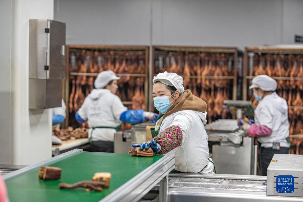 1月4日,在重慶市城口縣坪壩鎮新華村重慶美綴美食品有限公司,工人在外包裝車(chē)間將分割好的臘肉放上自動(dòng)包裝流水線(xiàn)。