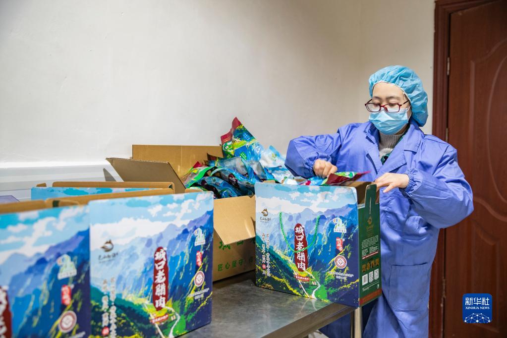 1月4日,在重慶市城口縣厚坪鄉白鶴村,重慶巴山物語(yǔ)食品加工有限公司的工作人員在打包即將發(fā)貨的香腸。