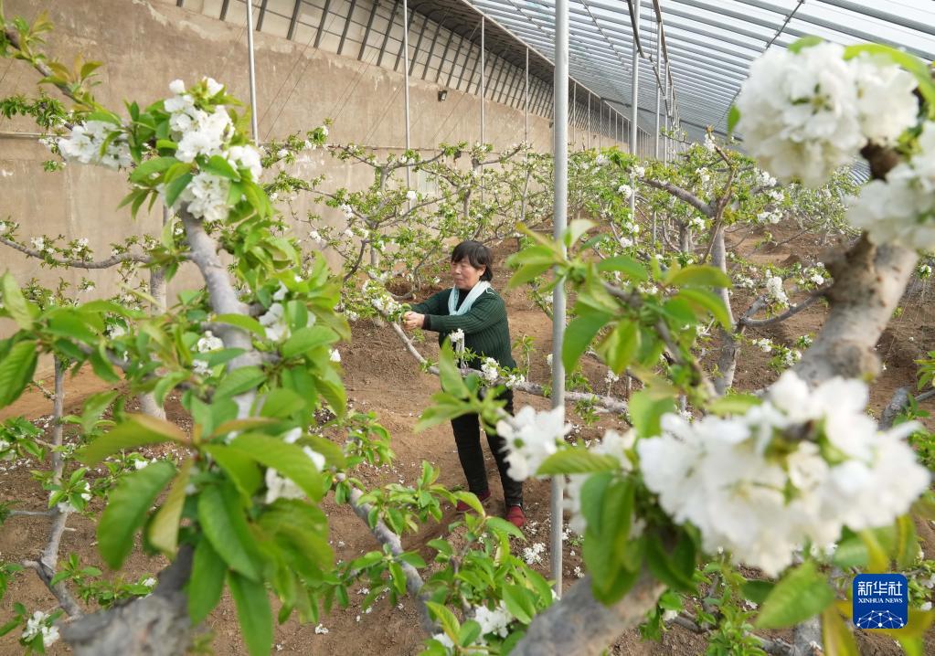 1月6日,在秦皇島市海港區海陽(yáng)鎮一家櫻桃種植合作社,農民在大棚內給櫻桃樹(shù)疏花。