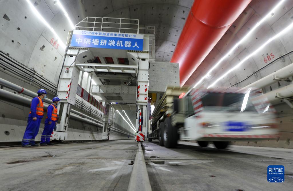 1月6日,在中鐵隧道局上海市域鐵路機場(chǎng)聯(lián)絡(luò )線(xiàn)11標項目施工現場(chǎng),一輛新能源雙頭車(chē)從中隔墻拼裝機器人旁駛過(guò)。