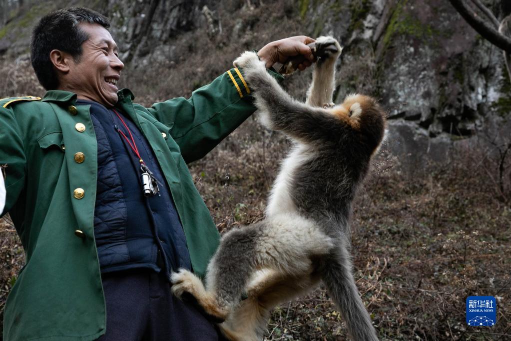 楊忠錄與大熊貓國家公園甘肅省片區裕河園區內的川金絲猴互動(dòng)(1月4日攝)。
