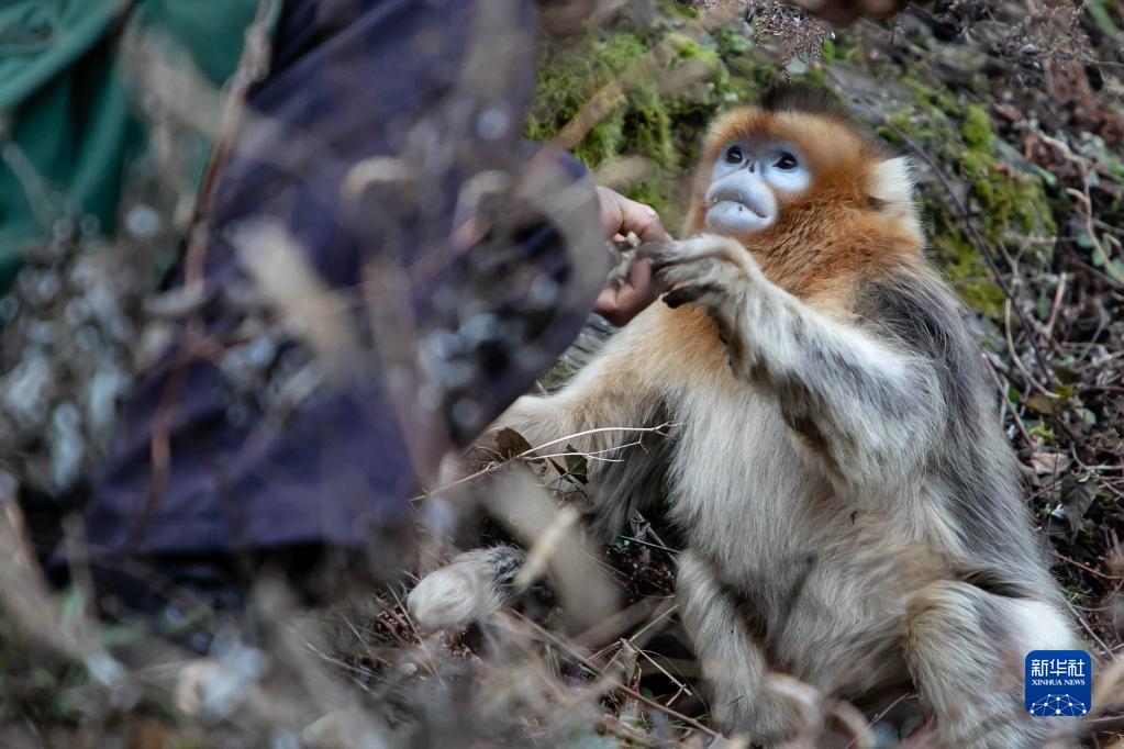 楊忠錄與大熊貓國家公園甘肅省片區裕河園區內的川金絲猴互動(dòng)(1月4日攝)。