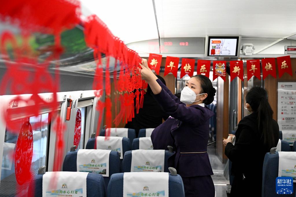 1月6日,鐵路工作人員在裝扮列車(chē)車(chē)廂。