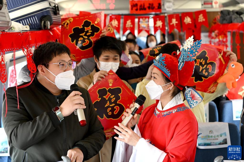 1月6日,鐵路工作人員和乘客在列車(chē)上一同演唱黃梅戲。