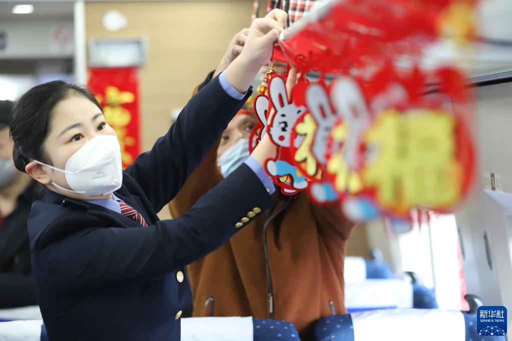 當日,中國鐵路南昌局集團有限公司南昌客運段的工作人員在G5305次列車(chē)與旅客一起掛中國結、貼春聯(lián),營(yíng)造喜慶氣氛。
