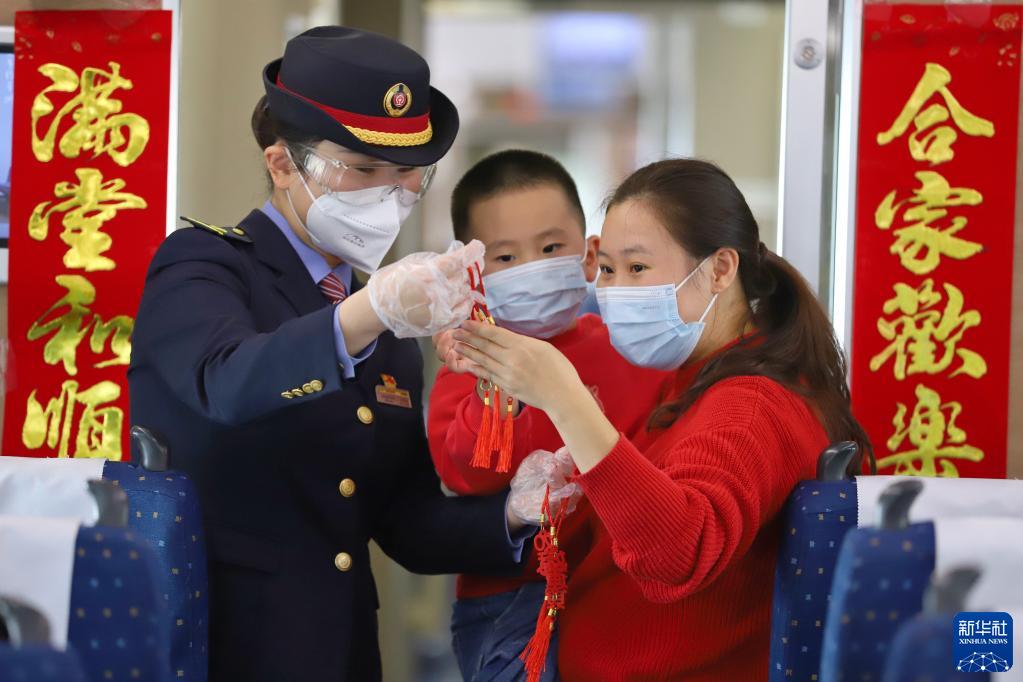 當日,中國鐵路南昌局集團有限公司南昌客運段的工作人員在G5305次列車(chē)與旅客一起掛中國結、貼春聯(lián),營(yíng)造喜慶氣氛。
