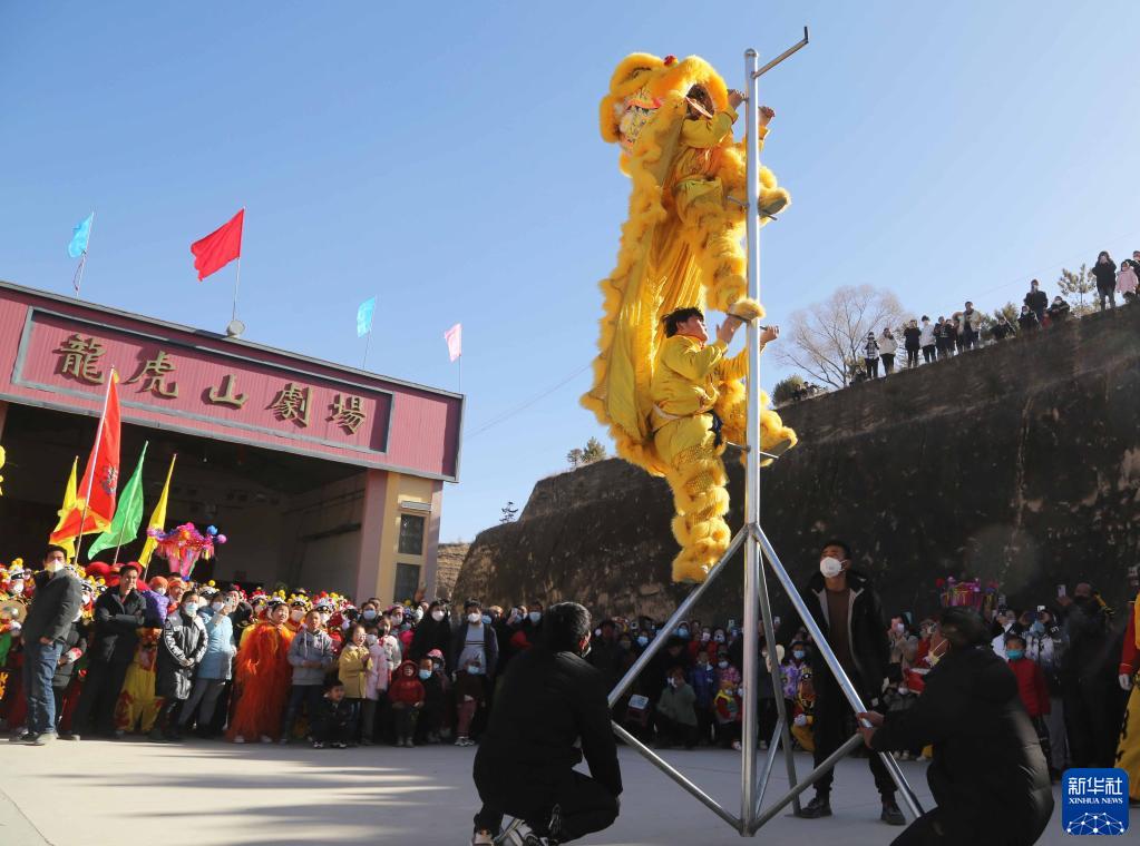 1月6日,甘肅省定西市安定區內官營(yíng)鎮萬(wàn)崖村社火隊演練傳統社火節目舞獅。