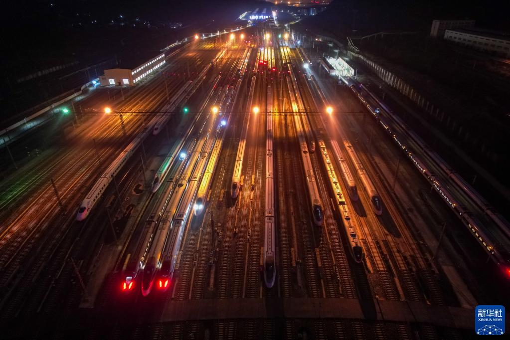 1月7日,2023年春運啟動(dòng)。1月6日晚,在中國鐵路成都局集團有限公司貴陽(yáng)北動(dòng)車(chē)所,??吭诖孳?chē)線(xiàn)上的動(dòng)車(chē)排列整齊如同一支“陸地艦隊”。