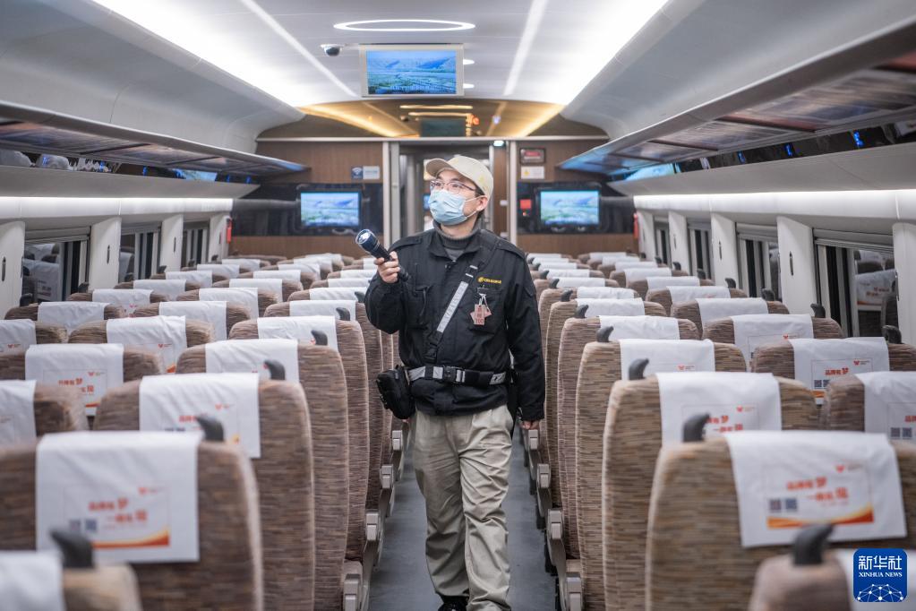 1月6日,地勤機械師在檢查動(dòng)車(chē)組列車(chē)行李架。