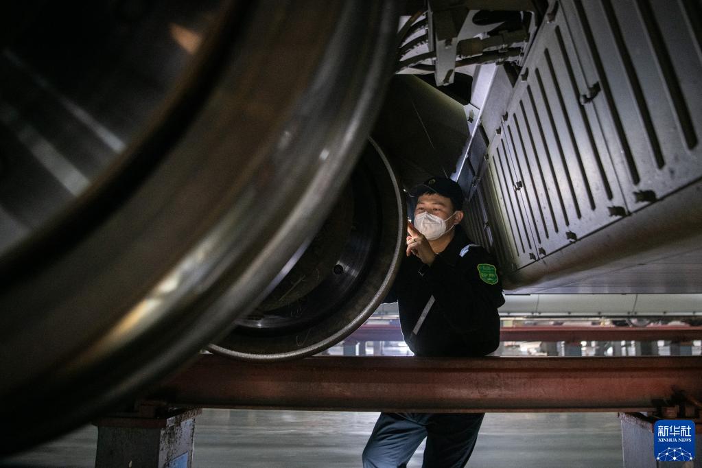 1月6日,地勤機械師在檢查動(dòng)車(chē)組列車(chē)狀態(tài)。