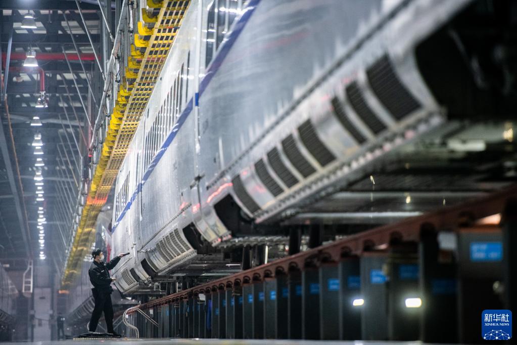 1月6日,地勤機械師在檢查動(dòng)車(chē)組車(chē)體外觀(guān)狀態(tài)。
