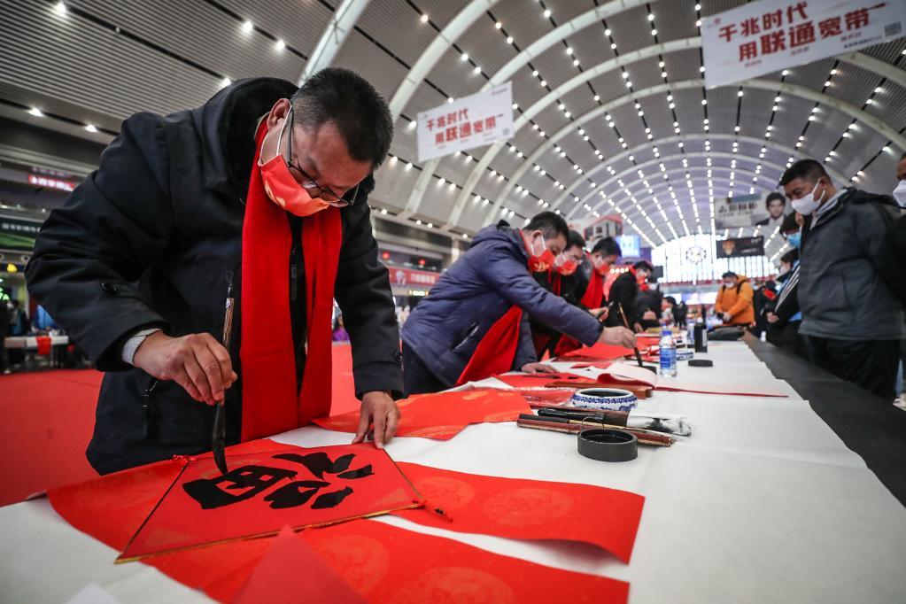 1月7日,書(shū)法家在沈陽(yáng)站內為旅客書(shū)寫(xiě)福字、對聯(lián)。