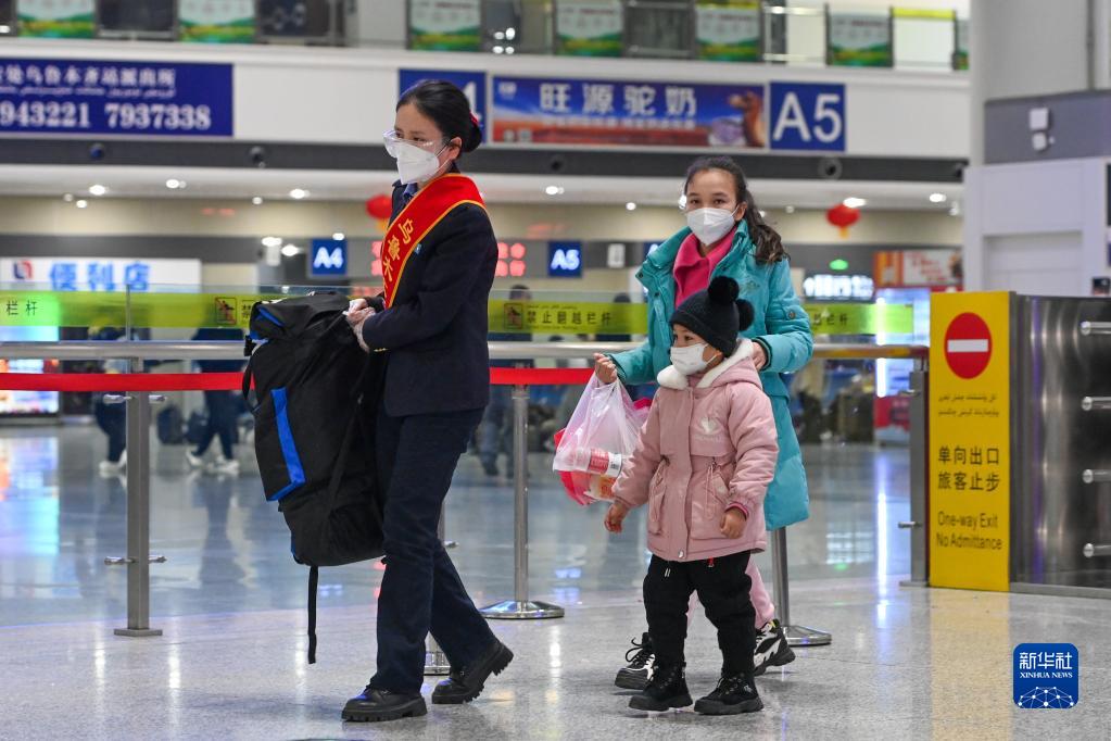 1月7日,在烏魯木齊站候車(chē)大廳,工作人員幫助帶小孩的旅客搬運行李。