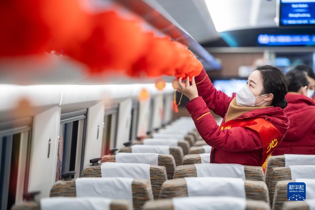 1月7日,在武漢站,乘務(wù)員在列車(chē)上掛新年燈籠。