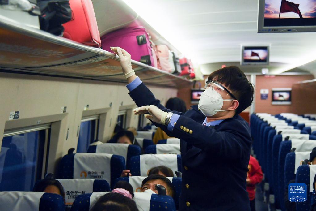 1月7日,在北京西站,列車(chē)乘務(wù)員在發(fā)車(chē)前檢查車(chē)廂行李放置情況。