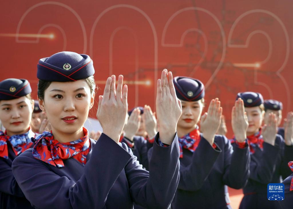 1月7日,中國鐵路鄭州局集團有限公司鄭州客運段的乘務(wù)員在鄭州東站西廣場(chǎng)進(jìn)行服務(wù)禮儀展示。