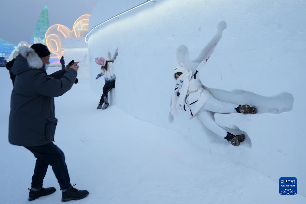 近日,許多游客來(lái)到哈爾濱冰雪大世界,在一面有著(zhù)數十個(gè)不同造型人形凹槽的雪墻前“打卡”留影。