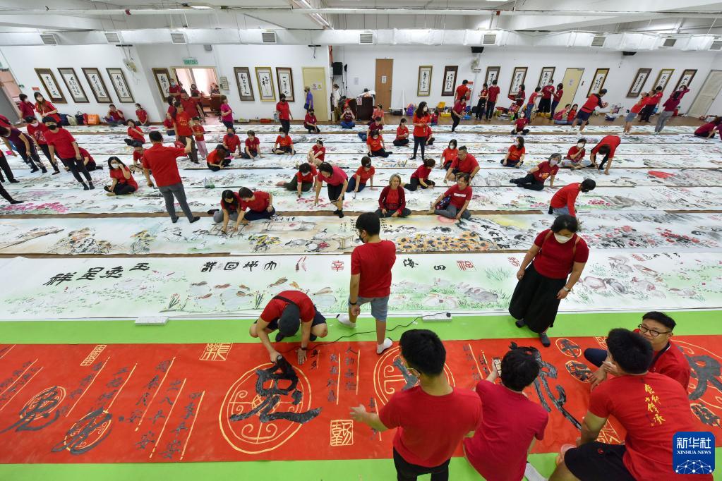 1月1日,在馬來(lái)西亞雪蘭莪州的仁嘉隆,書(shū)畫(huà)愛(ài)好者參與創(chuàng )作以“兔陣涌春”為主題的水墨畫(huà)長(cháng)卷,迎接2023新年和即將到來(lái)的農歷兔年。