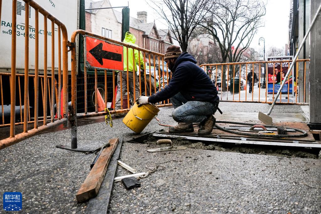 1月6日,一名工人在美國紐約修理人行道地面。