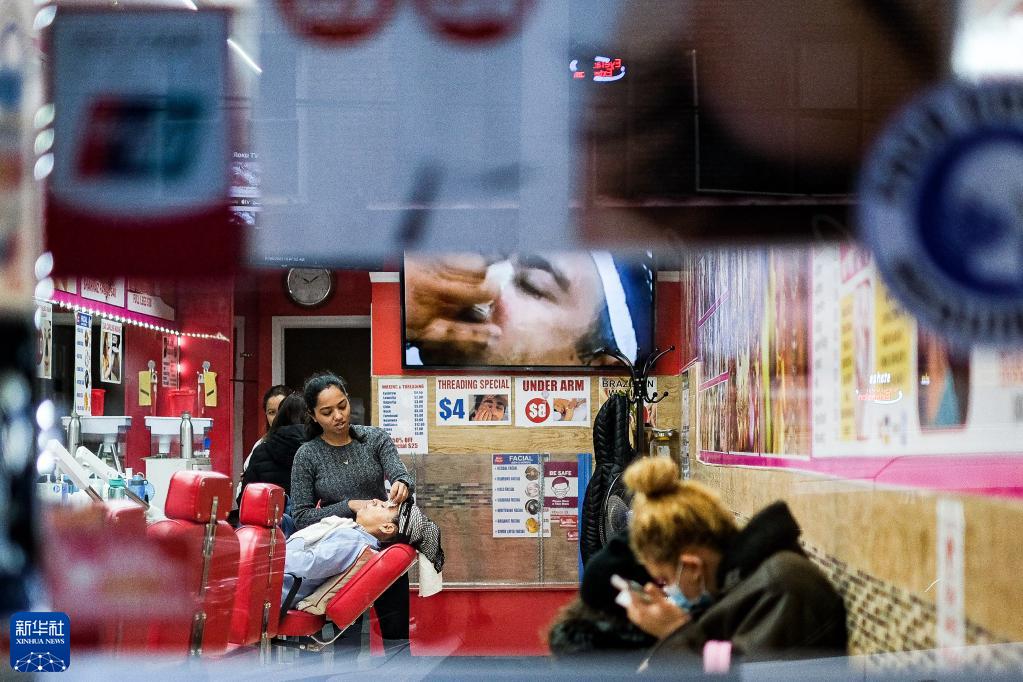 1月6日,美國紐約一家美發(fā)沙龍的工作人員為顧客服務(wù)。