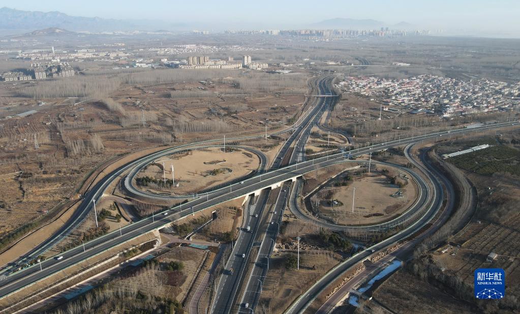 1月7日,車(chē)輛從秦皇島市北戴河區境內的西部快速路與省道364線(xiàn)互通立交橋上通過(guò)(無(wú)人機照片)。