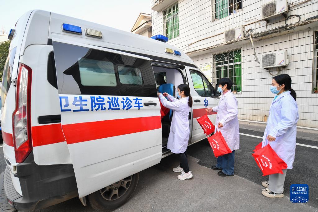 1月7日,在湖南省湘潭市雨湖區,醫護人員將防疫健康包運送到巡診車(chē)上。