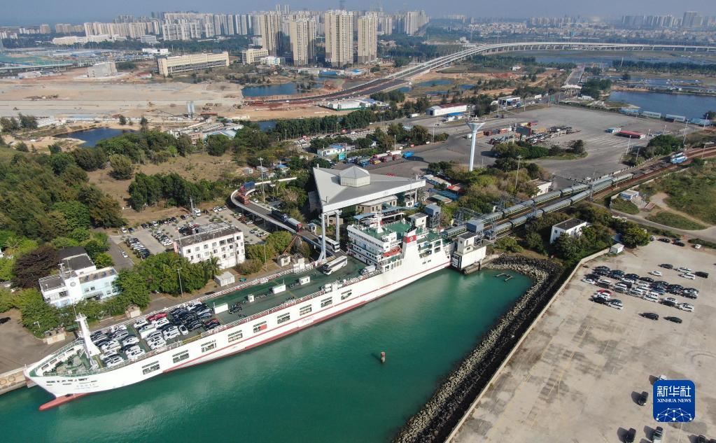 1月6日,在位于??诘幕浐hF路輪渡南港碼頭,粵海鐵1號輪渡??坎次徊⒀b載列車(chē)(無(wú)人機照片)。