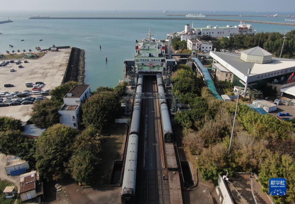 1月6日,在位于??诘幕浐hF路輪渡南港碼頭,列車(chē)解編后駛入粵海鐵1號輪渡(無(wú)人機照片)。