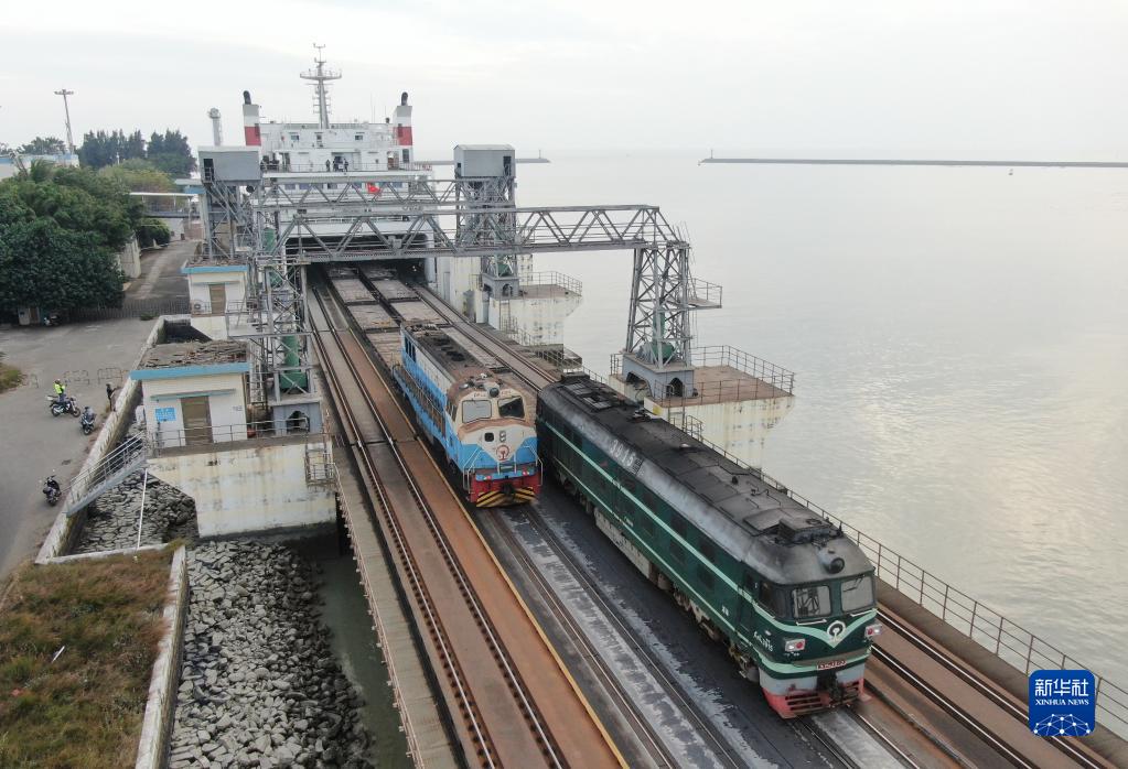 1月6日,在廣東徐聞的粵海鐵路輪渡北港碼頭,機車(chē)正在牽引粵海鐵1號輪渡上的列車(chē)駛出(無(wú)人機照片)。