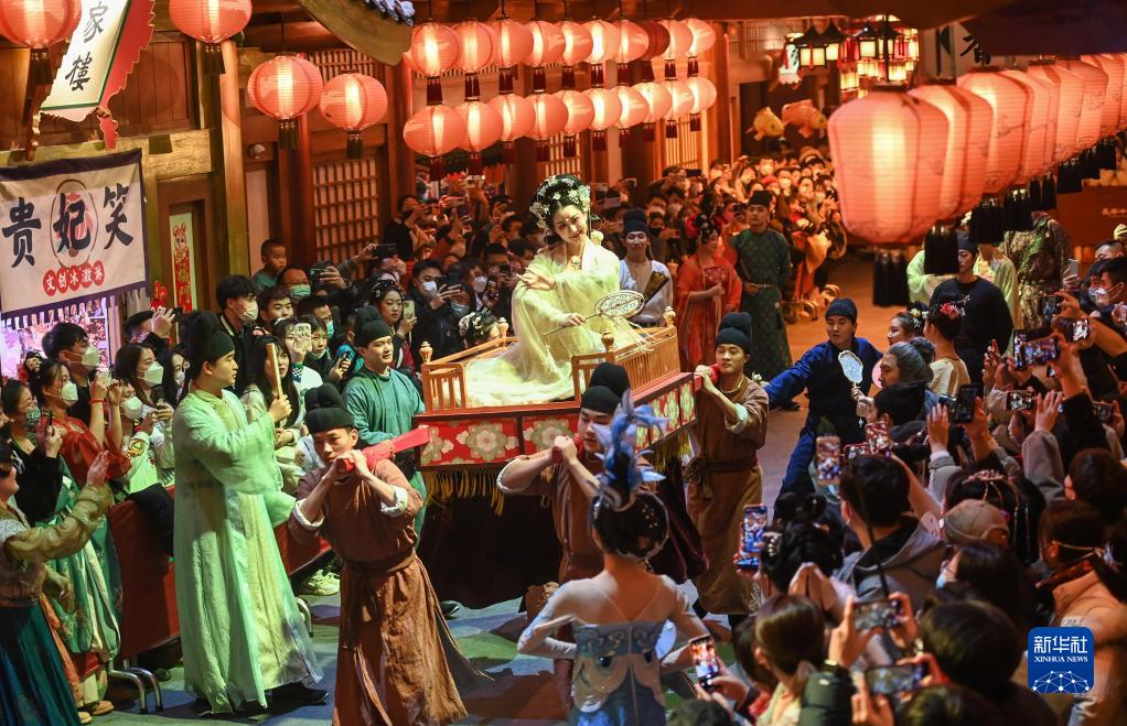 游客在陜西西安長(cháng)安十二時(shí)辰主題街區觀(guān)看表演(2022年12月31日攝)。元旦假期期間,各地消費市場(chǎng)人氣漸旺,暖意漸濃。