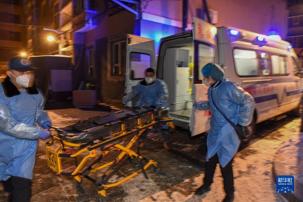 長(cháng)春市急救中心富民大街急救站擔架員徐文超、李冰和醫生李立群(從左至右)下車(chē)整理裝備趕往一位患者家中,準備對其進(jìn)行急救(2023年1月1日攝)。