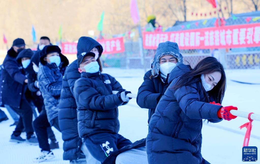 1月7日,在河北省秦皇島市海港區一家滑雪場(chǎng),市民參加雪地拔河活動(dòng)。