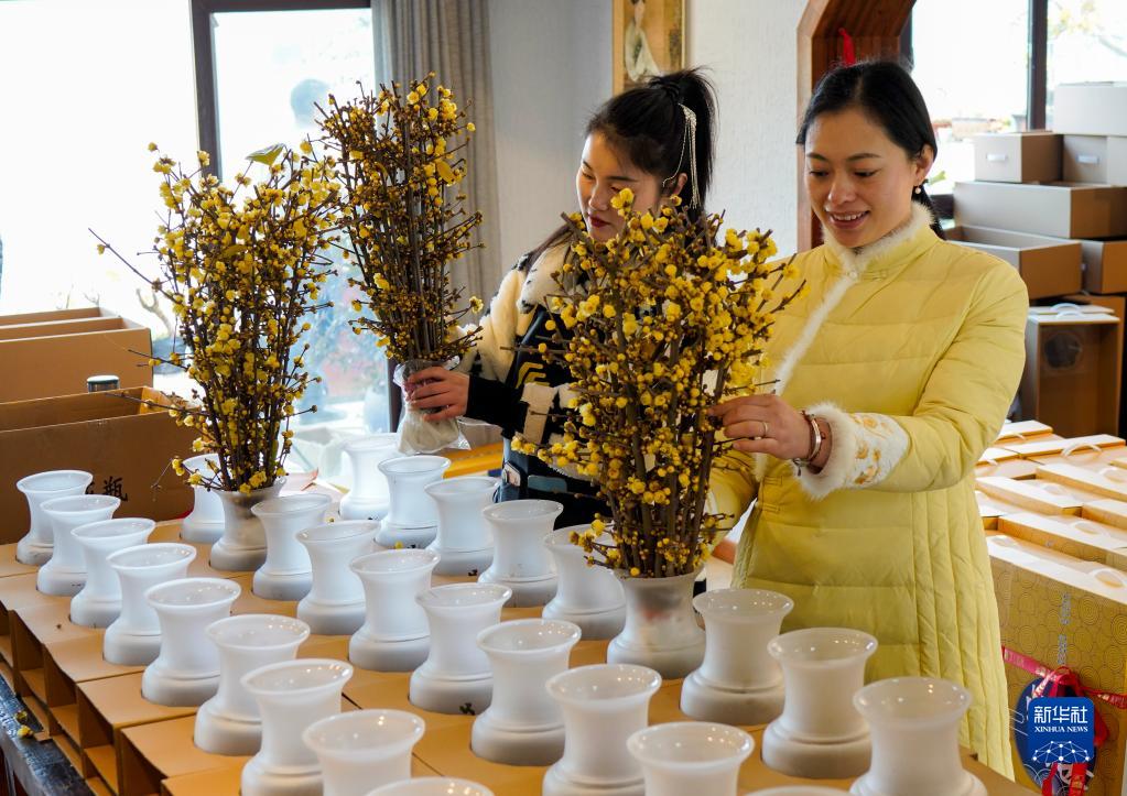 1月7日,在重慶市北碚區靜觀(guān)鎮一家創(chuàng )意工坊,插花師在整理顧客訂購的臘梅花。