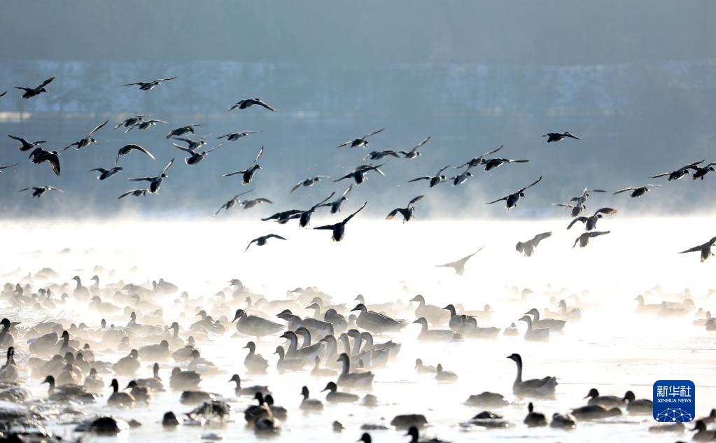 近日,在遼寧省沈陽(yáng)市渾河上,萬(wàn)余只鴻雁、赤麻鴨、鴛鴦等候鳥(niǎo)遷徙來(lái)此棲息。它們成群結隊在河面上嬉戲、休憩,成為冬日里一道美麗的風(fēng)景線(xiàn)。